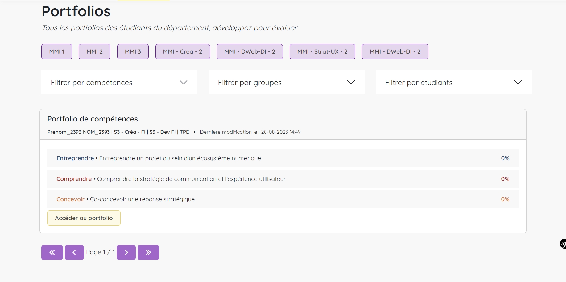 Toujours sur votre dashboard, vous allez trouver la section d'évaluation des portfolios. Le principe est sensiblement le même que pour les traces ; l'ensemble des portfolios des étudiants du département sont affichés, il suffit de filtrer pour amoindrir le nombre de resultats.