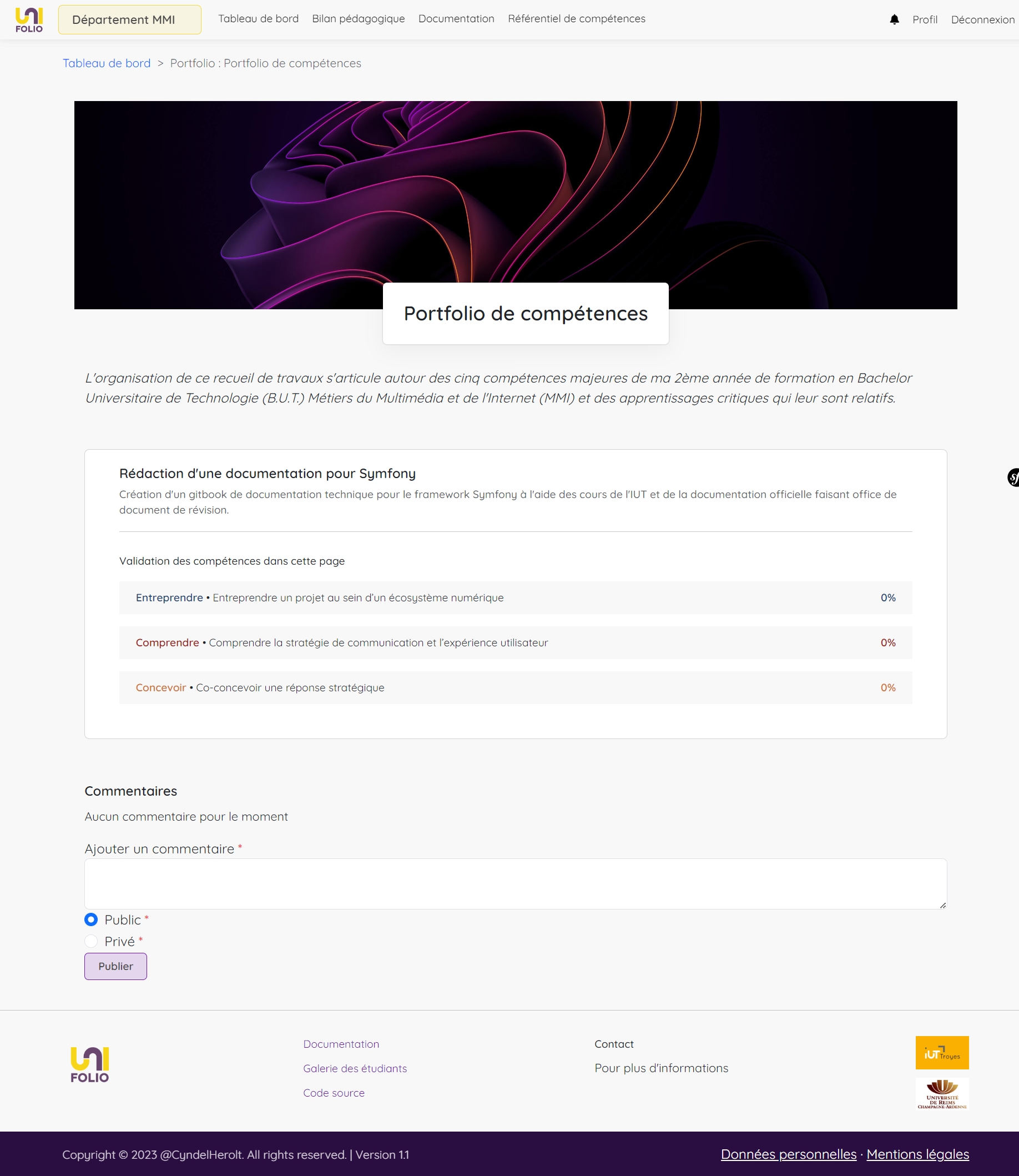 Sur la page de visualisation du portfolio sont regroupées les pages qui le composent (sur l'exemple il n'y en a qu'une mais il pourrait très bien en avoir plusieurs), le pourcentage de validation des compétences pour chacune d'entre elle ainsi qu'un formulaire permettant de laisser un commentaire. Ce commentaire fait office de bilan général du portfolio.
