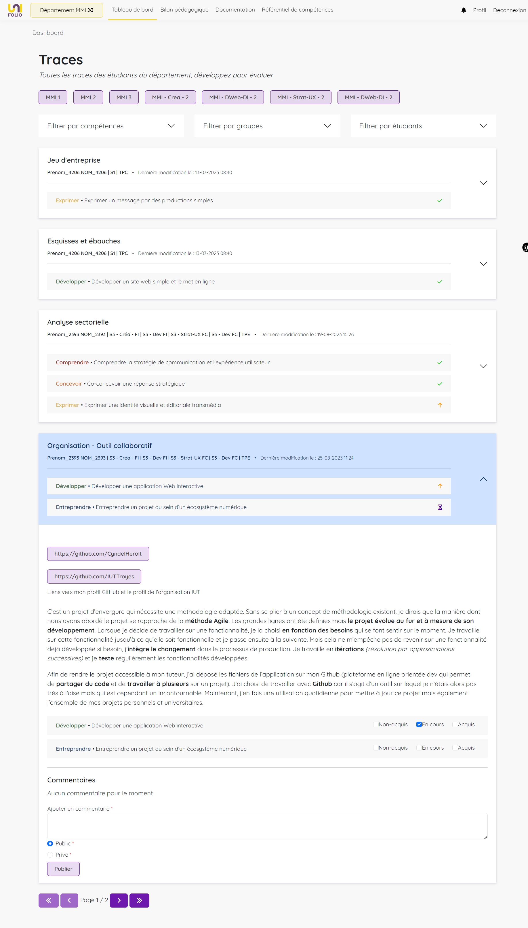 Dans un premier temps, vous allez trouver la section d'évaluation des traces. Elle rassemble l'ensemble des traces créées par les étudiants de votre département mais vous pouvez filtrer les resultats par années, par compétences, par groupes et par étudiants (les filtres sont cumulables). Les resultats sont un condensé des informations essentielles pour se repérer : le titre, l'étudiant, la date de dernière modification et les compétences couvertes avec leur état d'évaluation (⌛ en attente d'évaluation, ❌ non acquis, ⬆️ en cours d'acquisition, ✅ acquis).